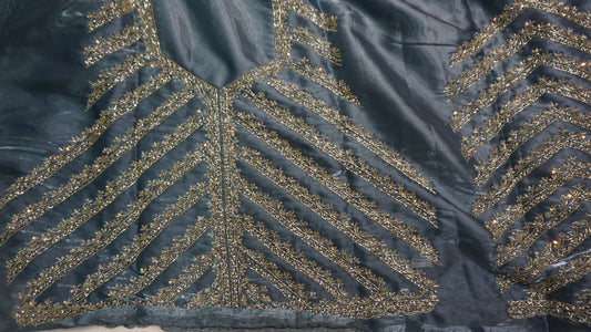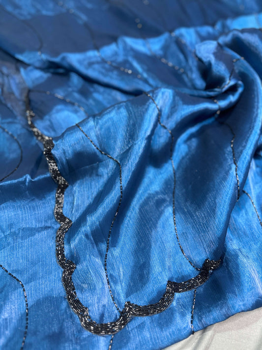 Haseena Blue Organza Satin Tissue Saree with black embroidery