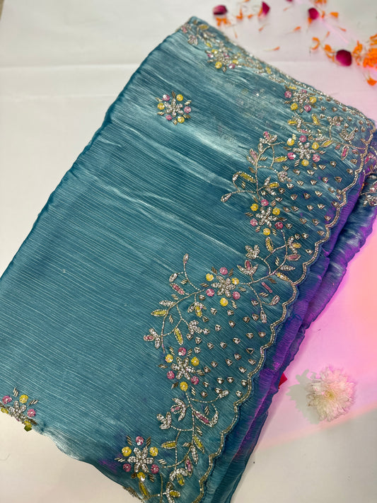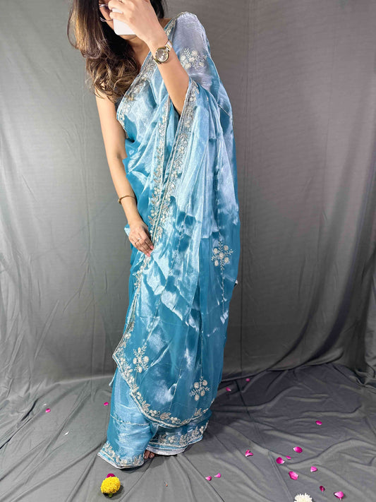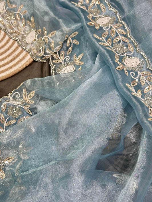 Pacific Blue Tissue Organza Handwork Embroidery Saree