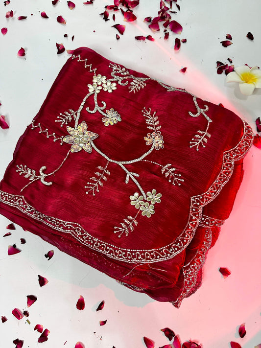 Deep Red Tissue Organza Floral Hand Embrloidered Saree